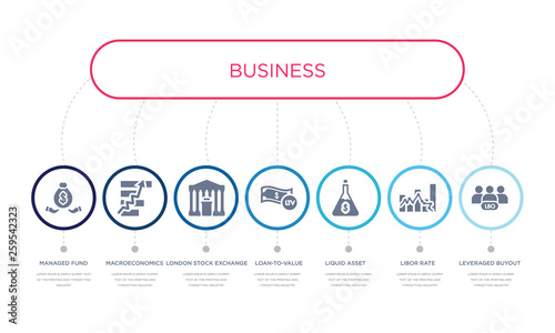 Simple Illustration Set Of 7 Vector Blue Icons Such As Leveraged